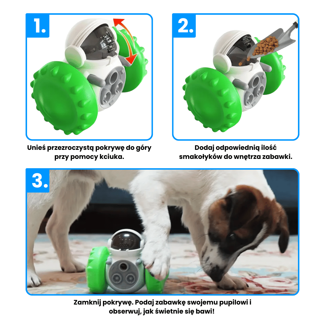 Mechanizm tumblingowy: Lekko przechylana kula otwiera się po obróceniu, nagradzając psa lub kota przysmakiem po kilku próbach.